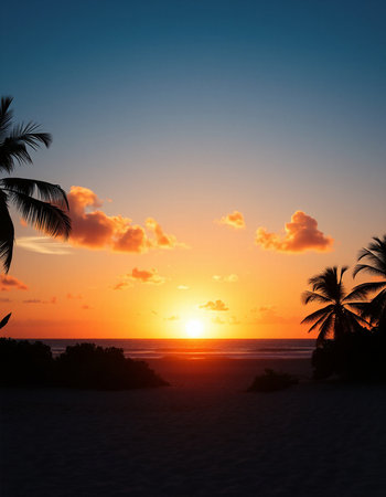 Beautiful sunset on a tropical beach with palm trees silhouettes.