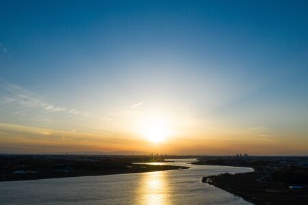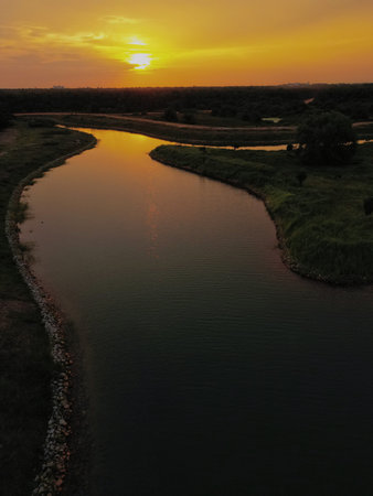 Aerial view of sunset over river. Beautiful landscape with river.