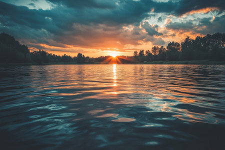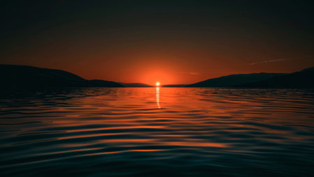 Sun showing sunset over calm water with ripples keywords: sunset, sun, sky, water, lake, river, ocean, horizon, light, golden, orange, yellow, reflection, ripples, waves, nature, landscape, evening, dusk, serene, peaceful, beauty, outdoor, scenic, atmospheric description: a breathtaking sunset paints the sky with vibrant golden and orange hues. the sun is low on the horizon, casting a brilliant reflection on the calm water. small ripples on the water's surface catch the light, creating a...