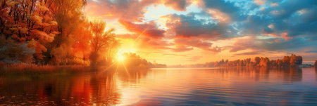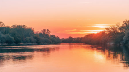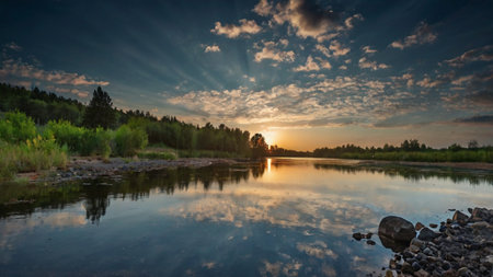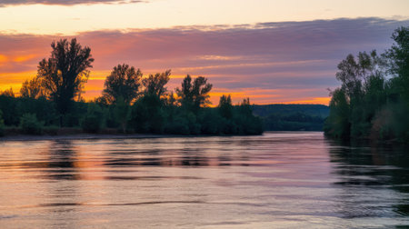 A serene river landscape at sunset with vibrant colors in the sky and a reflection of trees in the calm water. Clear details and vibrant colors enhance visual appeal. resolution use.