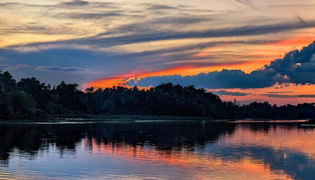 A sunset or sunrise scene over a lake or river with dramatic cloudy skies reflecting in the water on a summer evening or morning. Landscape.