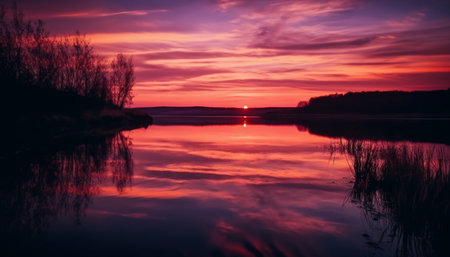 Tranquil sunset over water, reflecting vibrant autumn colors in nature generated by artificial intelligence