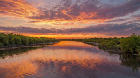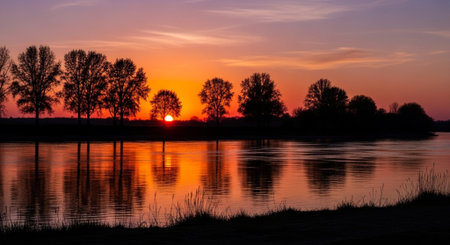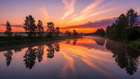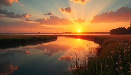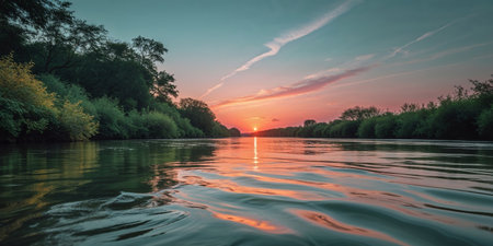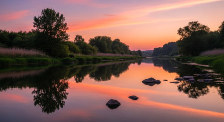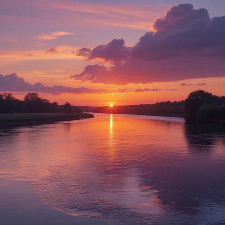 a beautiful river landscape with a vibrant sunset reflecting in the calm flowing water