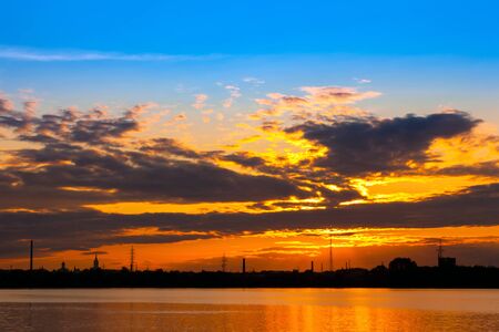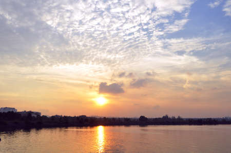 Sunset over the river. Beautiful sky with clouds at sunset.