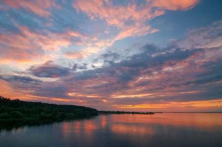 Sunset over the river Dnipro in Ukraine. Beautiful summer landscape.