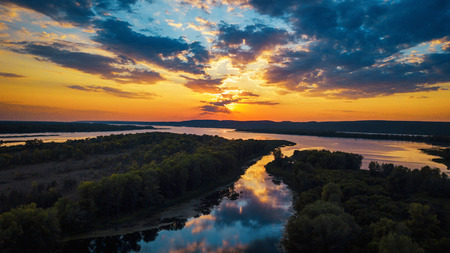 Aerial view to sunset on the river at summer evening with clouds and trees. Water reflection of a sky.