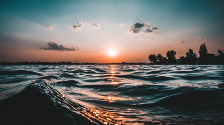 A breathtaking view of a sunset over a calm body of water. The vibrant teal waves reflect the golden sun, with a distant silhouette of trees against a soft sky.