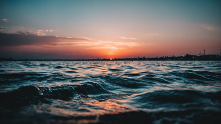 A close-up shot of dark blue ocean water with gentle waves. The setting sun creates a beautiful orange and pink sky, reflecting on the waters surface. A peaceful and tranquil scene.