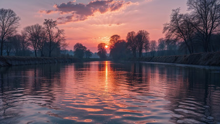 Tranquil river reflecting a beautiful sunrise with pink and orange hues, creating a serene and colorful landscape. Ai generated image