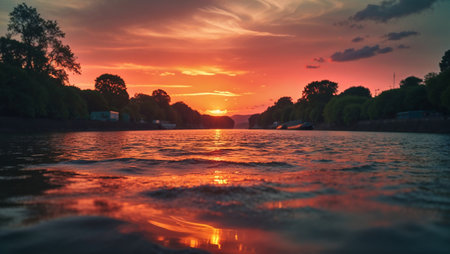 Vibrant sunset reflecting on calm river water with lush green trees. Ai generated image