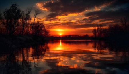 A breathtaking sunset casts warm hues over tranquil water, with silhouetted trees enriching the serene landscape, evoking a sense of peace and natural beauty.