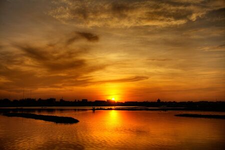 Hazy Asian sunset over lake in Cambodia