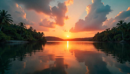 Tropical sunset over calm water with palm tree silhouettes