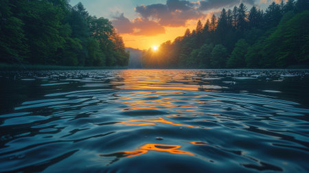 Breathtaking Sunrise Illuminates the Peaceful Lake, Casting Beautiful Reflections on Tranquil Waters