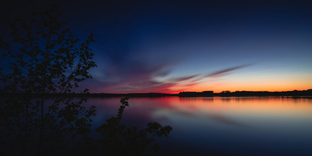 A panoramic view of the silhouettes of landscape near the lake with reflection on the water at sunset