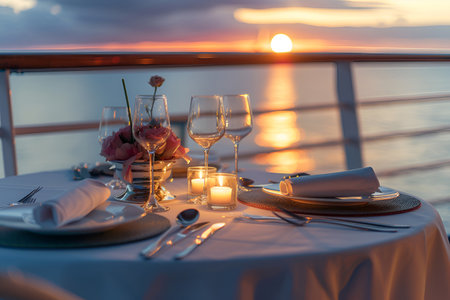 An intimate dining setup on a cruise ship with candles, flowers, and wine glasses, overlooking a serene sunset on the ocean.