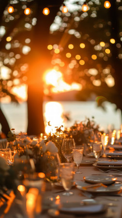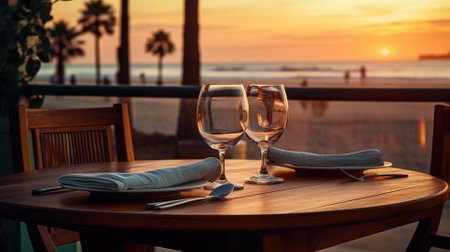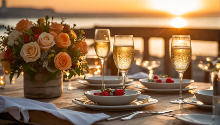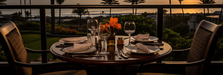 A beautifully set table overlooking a stunning sunset. Perfect for a special occasion or a relaxing evening at home. Ideal for restaurant, hotel, or travel websites.