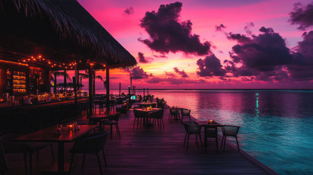 Outdoor beachfront bar and restaurant, with tables and chairs set up on a wooden deck, overlooking a calm ocean. The sky is ablaze with vibrant sunset colors.