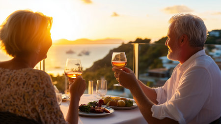 Couple enjoying a romantic sunset dinner together on a terrace overlooking the ocean with elegant dishes and drinks