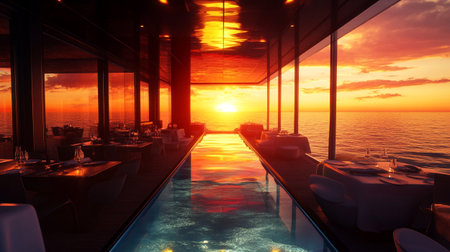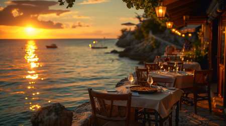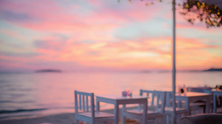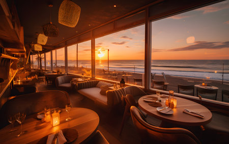 beachside eatery with view of sunset, warm colors and gentle waves, created with generative ai