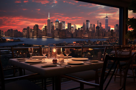 New York City at sunset viewed from a restaurant. A high quality image making by generative ai.