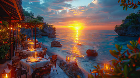 Romantic candlelit dinner on the beach at sunset sky in a luxury resort with breathtaking sea view