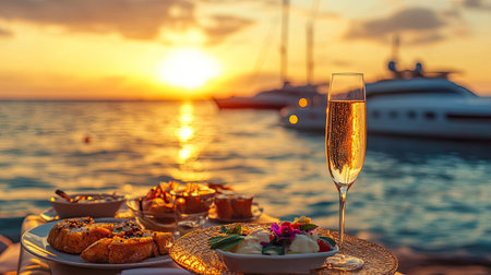 A close-up captures a beautifully arranged meal with champagne glasses and fresh salad on a table. The scene is bathed in warm sunset colors, with water and boats visible in the background. This image has commercial applications for illustrating dining, travel, or romantic occasions.