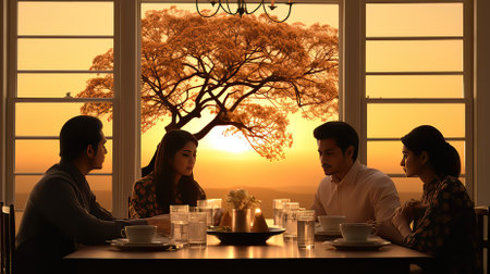 A stunning sunset view through a window with people in silhouette, perfect evening. Silhouetted people enjoying the sunset view through a large window in a warm and peaceful atmosphere of a restaurant