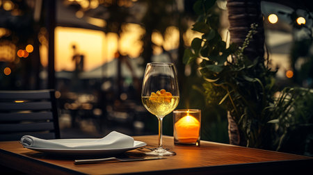 Dinner in a chic restaurant, on the terrace in the fresh air, by candlelight with a glass of champagne or wine, with beautiful glowing lights. Valentine's day, newlyweds, engagement, holiday, birthday, wedding, anniversary, surprise, date.