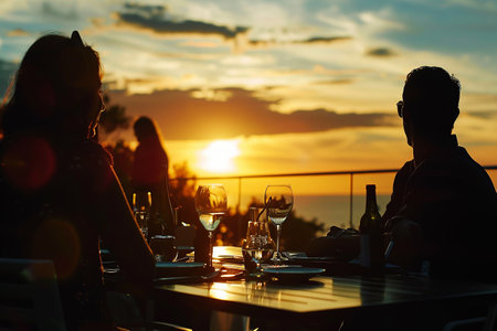 Two individuals sit at a table holding glasses of wine as the sun sets over the ocean. The scene is bathed in warm tones of orange and gold, suggesting a tranquil and intimate setting. The composition features silhouettes against the bright sky, creating a feeling of togetherness suitable for various commercial purposes.