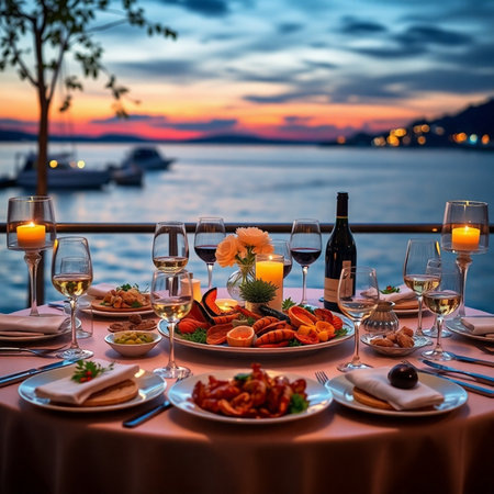 Scenario by the sea: restaurant, fruits of the fresh seafood, existing dishes at dusk., generative AI