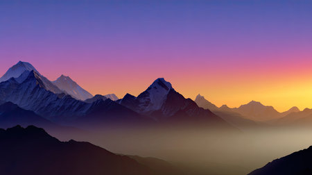 A breathtaking view of a majestic mountain range at sunrise, showcasing vibrant colors and mist hovering over the peaks, inviting tranquility and exploration.