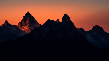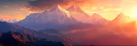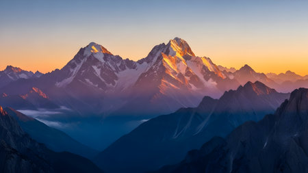 Snow capped mountain peaks emerge majestically at sunrise, glowing with warm hues against a vibrant sky. The tranquil atmosphere inspires awesome.