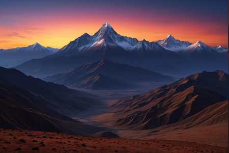 Stunning sunset over a majestic mountain range with exquisite colors blending in the sky. Ideal for conveying peacefulness, natural beauty, and outdoor adventures.