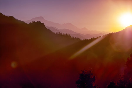 Sunset in Himalaya, Nepal. Panoramic view of the mountains.