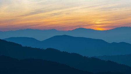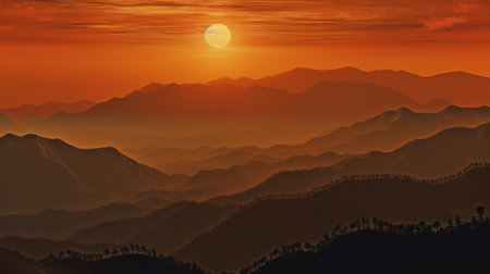 Layers of mountains stretch across the horizon as the sun sets creating a beautiful gradient of warm colors. The scene captures the tranquility of nature.