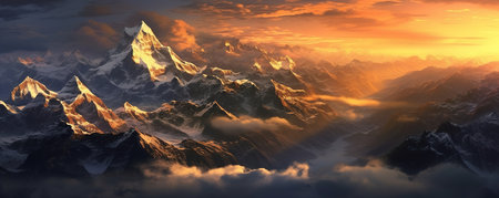 Breathtaking panorama featuring majestic snow-capped mountains illuminated by golden sunrise and dramatic colorful sky at dawn