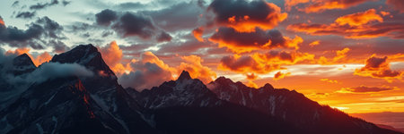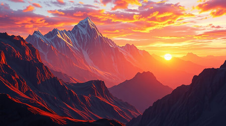 This breathtaking image captures the grandeur of a majestic mountain range its peaks piercing the clouds under a sky ablaze with the rich hues of a stunning sunset The dramatic lighting casts a warm