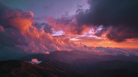 colorful sunset over mountain ranges, serene sunset casting hues over distant peaks and valleys