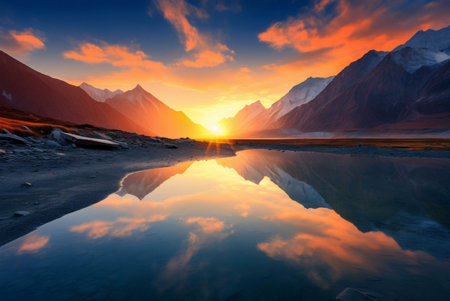 A fiery sunset casts a warm glow over the rugged mountains, creating a breathtaking scene