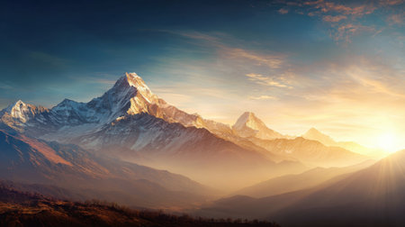 A stunning view of a snow-capped mountain peak illuminated by the golden light of the setting sun in the Himalayas.