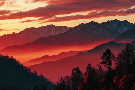 A Breathtaking sunset over mountains with vibrant red and orange hues Generative Ai