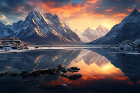 Mountain lake in Himalayas at sunset, perfect reflection at sunrise, snowy mountains, hills, fog over the lake AI generated