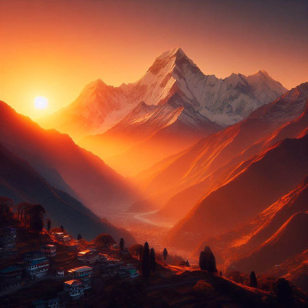 A village nestled among mountains experiences a breathtaking sunset, illuminating the rocky landscape and valley below.
