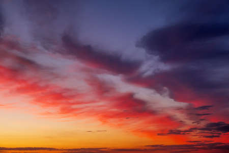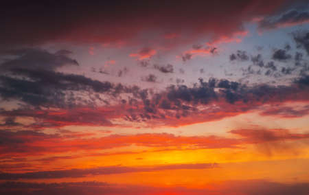Dramatic sky at sunset or sunrise with red and orange clouds. Variegated colored clouds at the evening sunset of the summer sky.