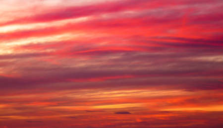 A bright colored sunset sky with red, orange and lilac stripes of clouds as a background.