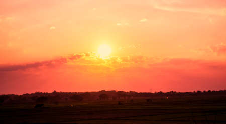Red sunset sky with clouds over dark foggy landscape. Bright sunny circle in the sky. Natural scenery, beautiful scenery in late evening. Copy space.