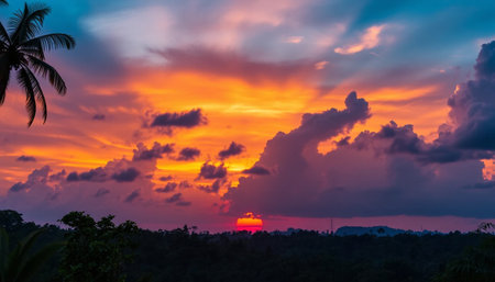 Colorful jungle sky glowing with sunset hues
