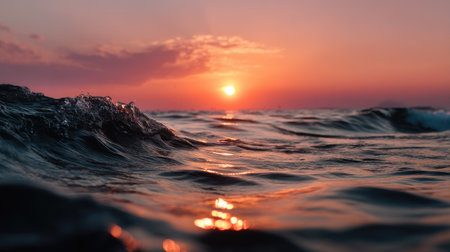 A stunning view of tranquil ocean waves reflecting a golden sunset, creating a serene atmosphere. The beautiful scenery captures the beauty of nature and peace.