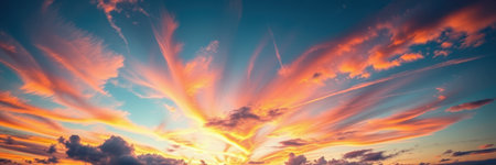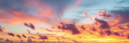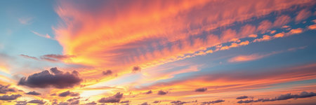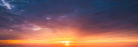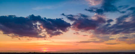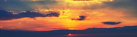 Panorama of beautiful vibrant sunset sky shining over horizon during golden hour natural background